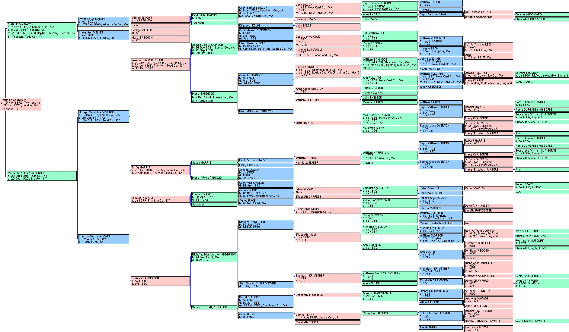This site describes the families of my ancestors. If you want more information, or can contribute information or corrections, please e-mail me. This section contains links to six family charts; the major surnames in the charts are listed below. These charts have no links...use your browser to return back to this page. The BACON Ancestor Chart outlines families from eastern Virginia, and Kentucky (Todd Co.).Families include BACON, DICKINSON, WARE, HARRIS, ANDERSON, SANDIDGE, BOXLEY, BULLOCK, OVERTON, EDLOE, THORNTON, & TALIAFERRO.A few of these lines go back to England. Also included in this chart are two families from Connecticut who moved to Elmira, Chemung Co., NY: WELLES, and BABCOCK. The GRADY Ancestor Chart outlines families from Virginia (Dinwiddie Co.) and North Carolina (Duplin Co.).Families include GRADY, FITTZ, OUTLAW, BARROW, ALDRIDGE, THOMAS, BARFIELD, WHITFIELD, LAWRENCE, & DAFNELL. The LAWRENCE line goes back to England. The KITCHIN Ancestor Chart outlines families from eastern Virginia and North Carolina (Granville, Edgecombe, & Halifax Co.).Families include KITCHIN, ARRINGTON, ALSTON, SMITH, HODGE, BRINKLEY, CROWELL, SANDIFUR, MACON, & ATHERTON.A few of these lines go back to England. The SATTERFIELD Ancestor Chart outlines families eastern Virginia, and North Carolina (Granville, Orange, & Person Co.).Families include SATTERFIELD, NORWOOD, JORDAN, WALKER, TROTTER, PATE, THOMAS, CHURCH, HOBSON, & AIKEN.Several of these lines go back to England. The STACK Ancestor Chart outlines families from Virginia, North Carolina, South Carolina, and Tennessee (Cheatham Co.).Families include STACK, MILES, PACE, BIGGER, PARDUE, DAVIS, SHAW, GUPTON, HUNT, & RACKLEY. The TRAVIS Ancestor Chart outlines families from eastern Virginia (Jamestown, Williamsburg, & Brunswick Co.).Families include TRAVIS, CLARK, STITH, HARRISON, WORTHAM, PARHAM, WALLER, MEBANE, MYRICK, & CHAMPION.A few of these lines go back to England.Also included in this chart is one family from Maryland: STANFORD.